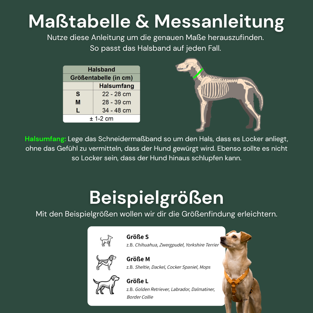 Unser Halsband gibt es in 3 Größen. Von Groß bis Klein ist für jeden Hund etwas passendes dabei.