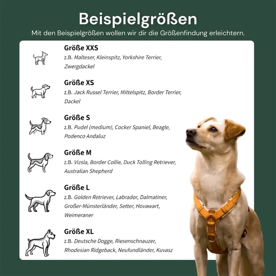 Unser Brustgeschirr gibt es in 6 passenden Größen. Von XXS bis XL ist für jede Hundegröße etwas dabei.